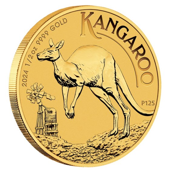 Rewers przedstawia kangura w naturalnym środowisku australijskiego outbacku. W otoku umieszczono napisy „KANGAROO”, „2024 1/2 oz 9999 GOLD” oraz oznaczenie „P125”, upamiętniające 125-lecie Perth Mint. Ten unikalny detal czyni edycję 2024 szczególną dla kolekcjonerów.