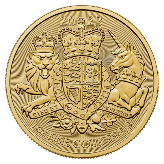 Złota moneta 1 uncja The Royal Arms 2023 to prestiżowa emisja brytyjskiej The Royal Mint, wykonana ze złota próby 999,9/1000. Prezentuje herb królewski Wielkiej Brytanii – znak historii, władzy i ciągłości monarchii.