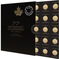 Zestaw 25 x 1g MapleGram 2025 – czyste złoto 999,9 w kapslach i blistrze. Oryginalny produkt Royal Canadian Mint. Kup teraz w GoldInvest24!