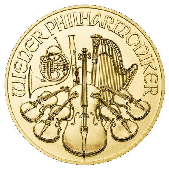 Złota moneta Filharmonicy Wiedeńscy 1/10 oz – czyste złoto 999,9, mieszane roczniki. Emitowana przez Münze Österreich, jedna z najpopularniejszych monet inwestycyjnych w Europie.