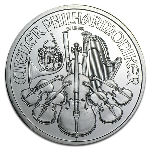 1 oz Filharmonicy Wiedeńscy Srebrna Moneta – Mieszane Roczniki. Bita przez Austriacką Mennicę ze srebra próby 999, z wizerunkiem organów Musikverein i instrumentów.