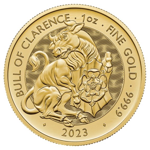 Kup 1 oz Tudor Beasts The Bull of Clarence 2023 – złota moneta bulionowa Royal Mint, 1 uncja czystego złota próby 999,9/1000. Symbol heraldyki Tudorów. Dostępna w GoldInvest24.