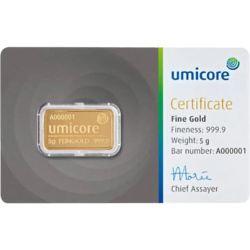 Złota sztabka 5g Umicore – złoto próby 999,9 od renomowanego producenta