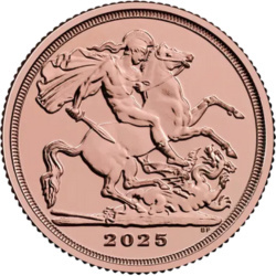 Rewers monety prezentuje legendarną scenę świętego Jerzego zabijającego smoka, autorstwa Benedetta Pistrucciego. Motyw ten niezmiennie kojarzy się z brytyjską potęgą numizmatyczną i historyczną ciągłością serii suwerenów.